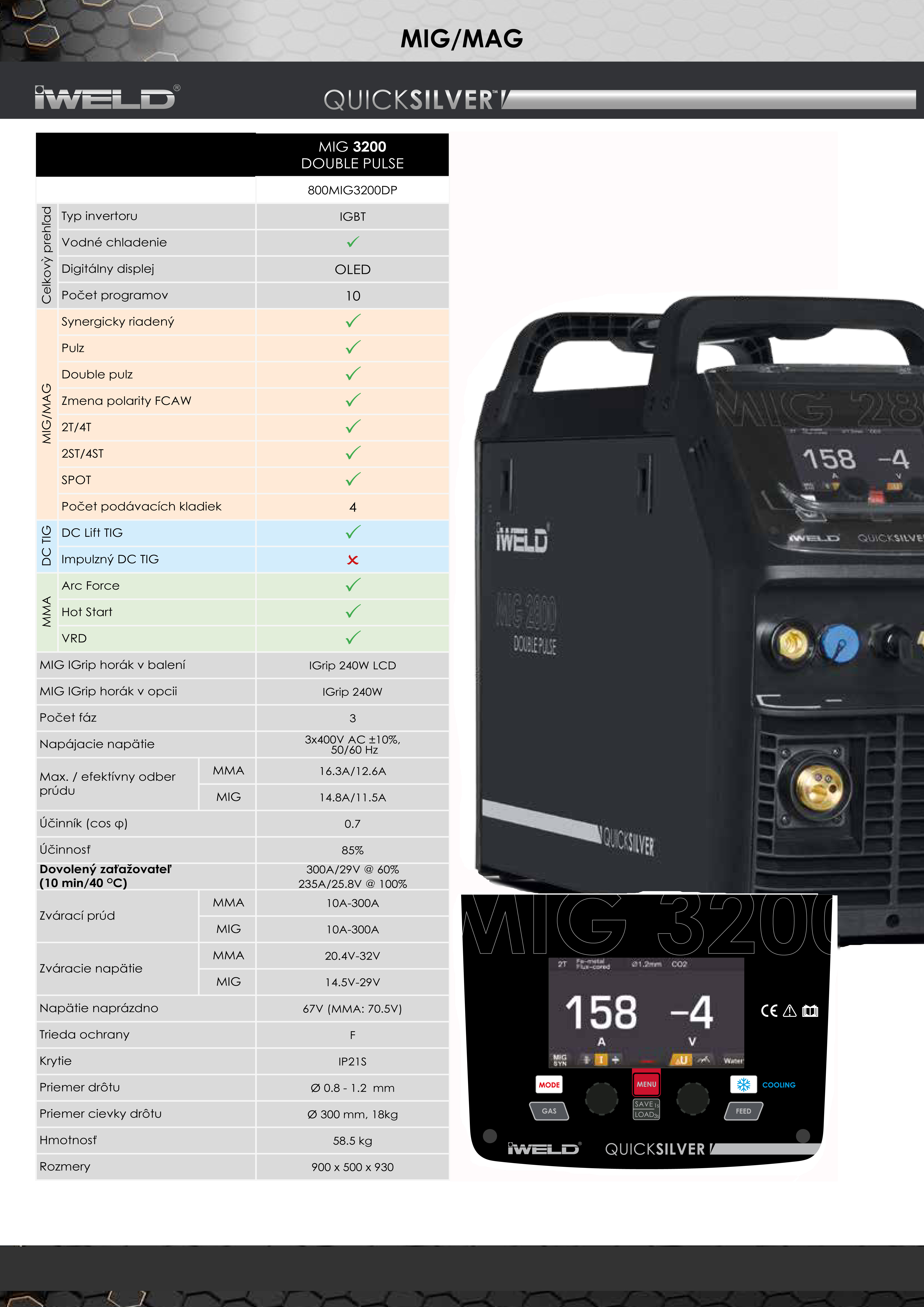 Zvárací multifunkčný invertor MIG/MAG/TIG a MMA s dvojitým pulzným režimom, pre zváranie ocelí, nerezových ocelí, hliníka a ich zliatin, s LCD displejom, zváranie s trubičkovým aj plným drôtom o priemere 0,8-1,2mm v režime 2T/4T/2ST/4ST a SPOT v ochrannej atmosfére CO2 a zmesných plynov. Príslušenstvo zvárací horák IGrip 240WLCD/4m.