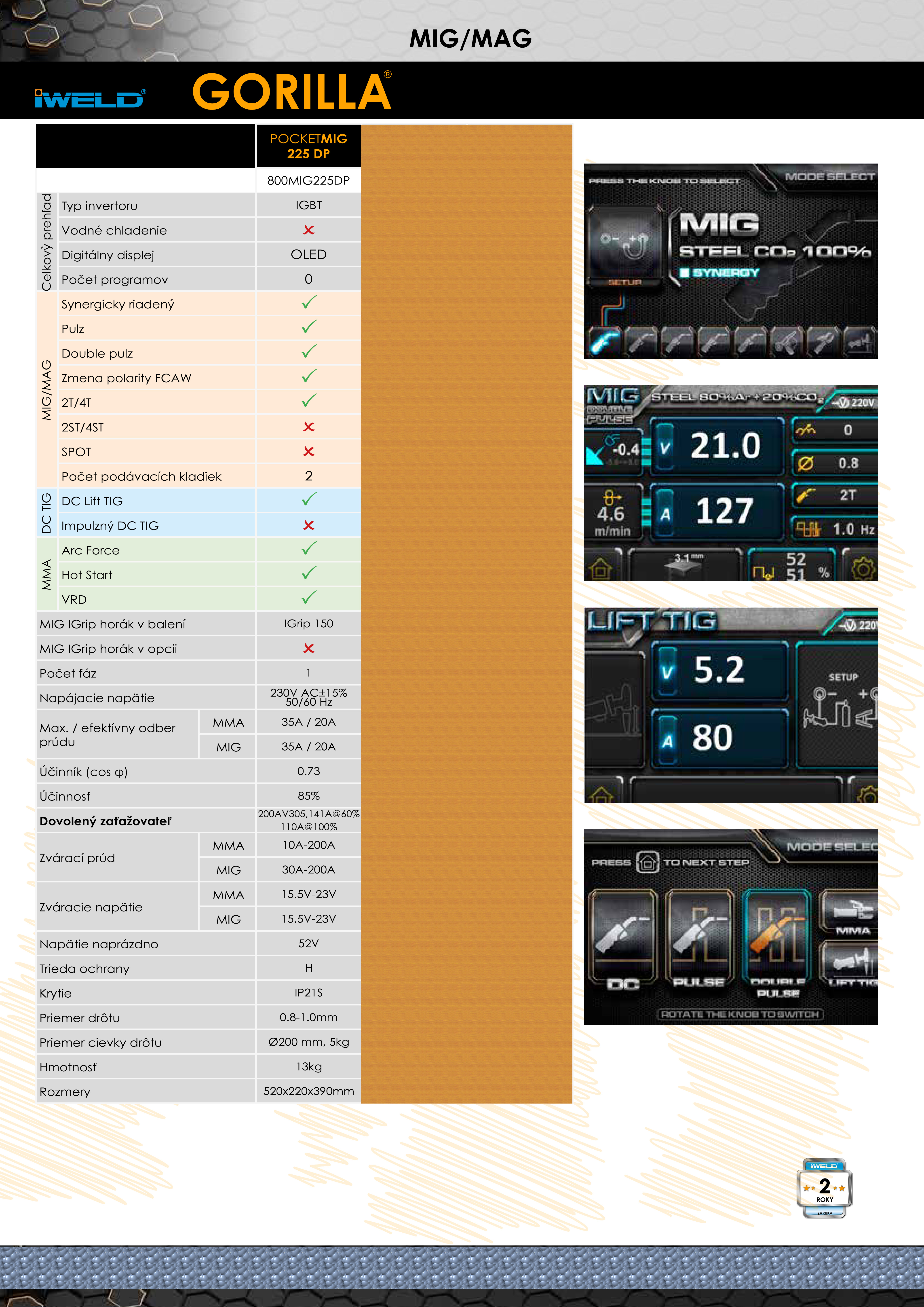 - Režimy: MIG/MAG synergický, pulzný, dvojitý pulzný, DC LifT TIG, FCAW zváranie, 2T/4T zváranie