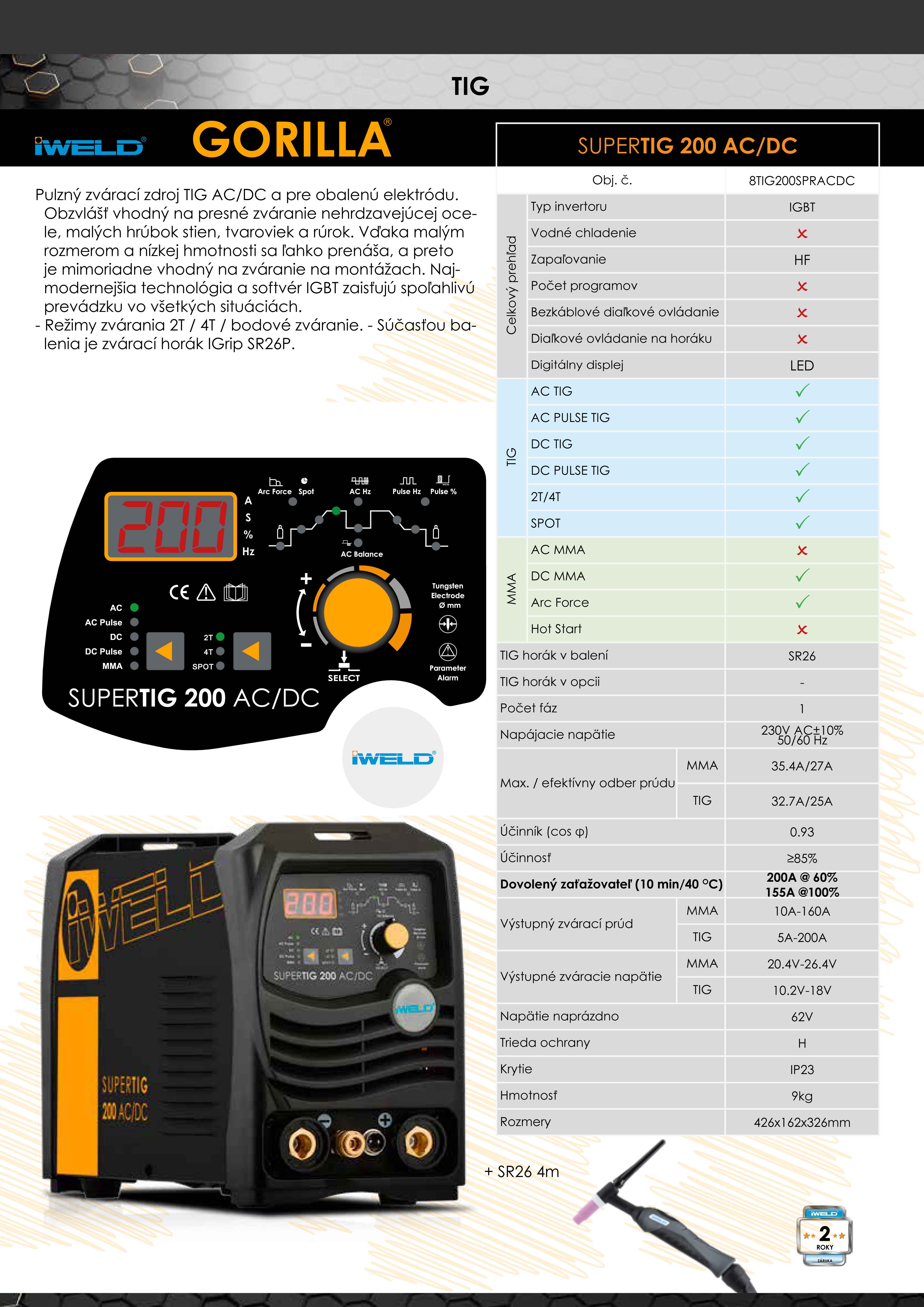 Zvárací invertor SuperTIG 200HF, určený na zváranie obaľovanou elektródou metódou MMA a zváranie v ochrannej atmosfére metódou TIG DC. Vyznačuje sa ľahkou, kompaktnou konštrukciou, jednoduchým ovládaním a vysokým výkonom.